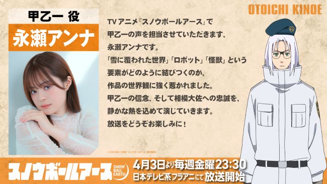 TVアニメ『スノウボールアース』で甲乙一の声を担当させていただきます、永瀬アンナです。