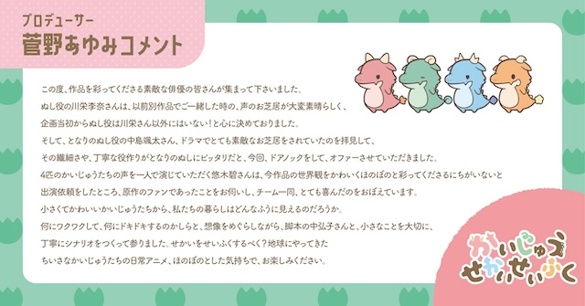 2025年4月よりTVアニメが放送される、ほのぼのシュール4コマ漫画『かいじゅうせかいせいふく』。このたび、メインキャストとして川栄李奈さん・中島颯太さん・悠木碧さんの起用が決定!あわせて、ティザーPV第2弾が公開となりました。