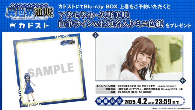 さらに、Blu-ray BOXの発売を記念して、アネモネ役・久野美咲さんの直筆サイン&宛名入りの特製ミニ色紙のプレゼントキャンペーンも開催。KADOKAWAの公式オンラインショッピングサイト「カドスト」にて、TVアニメ『アラフォー男の異世界通販』Blu-ray BOX 上巻を予約された方のみが対象となる先着順のキャンペーンとなります。