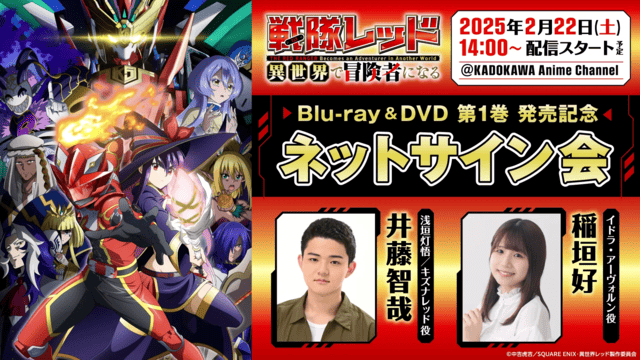 2025年1月12日(日)より放送がスタートしたTVアニメ『戦隊レッド 異世界で冒険者になる』のBlu-ray&DVD(全3巻)の発売が決定!特典内容も解禁となり、初回生産特典や店舗別のオリジナル特典など、ファン必携の豪華な特典が盛りだくさんです。Blu-ray&DVDの発売を記念して様々なキャンペーンの開催も決定!メインキャストのサイン入り台本プレゼントや、ネットサイン会など、見逃せないキャンペーン内容となっています。