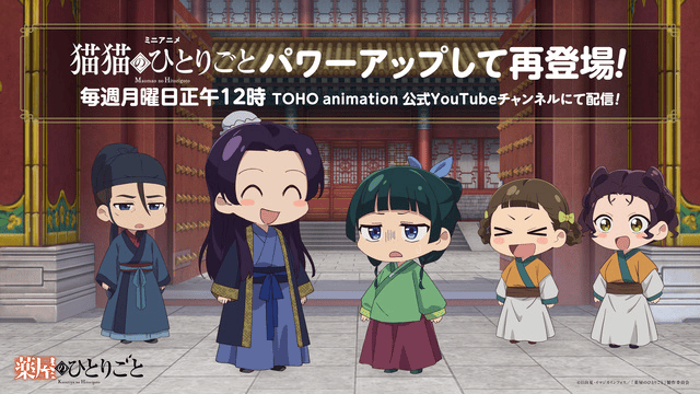ミニアニメ『猫猫のひとりごと』は、毎週月曜12:00に最新話が配信されます。アニメ本編とあわせて、楽しみましょう!