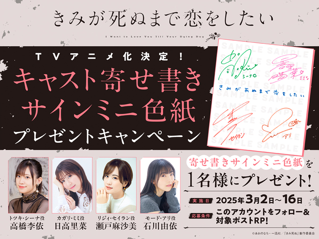 TVアニメ『きみが死ぬまで恋をしたい』公式Xにて実施となりますので、ふるってご参加ください。