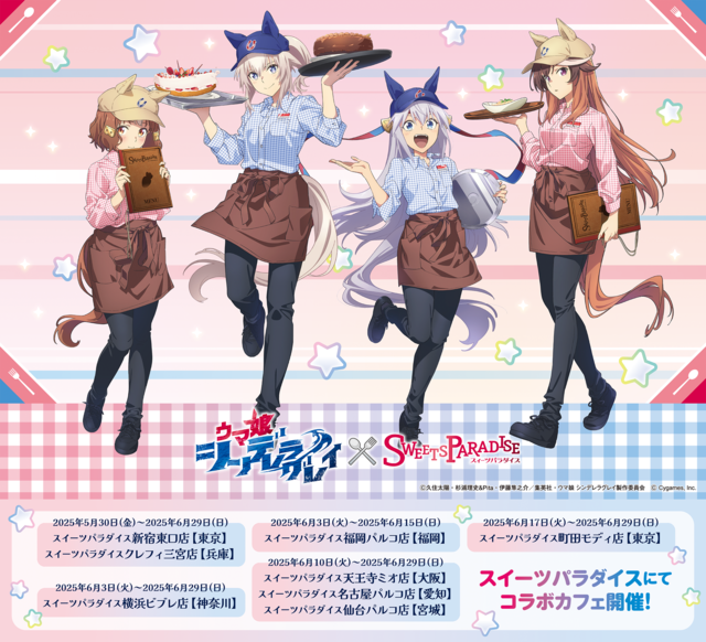 さらに、アニメ『ウマ娘 シンデレラグレイ』と「スイーツパラダイス」のコラボが開催決定! 5月30日(金)より全国8店舗で開催となります。詳細は「スイーツパラダイス」公式サイトをチェック!
