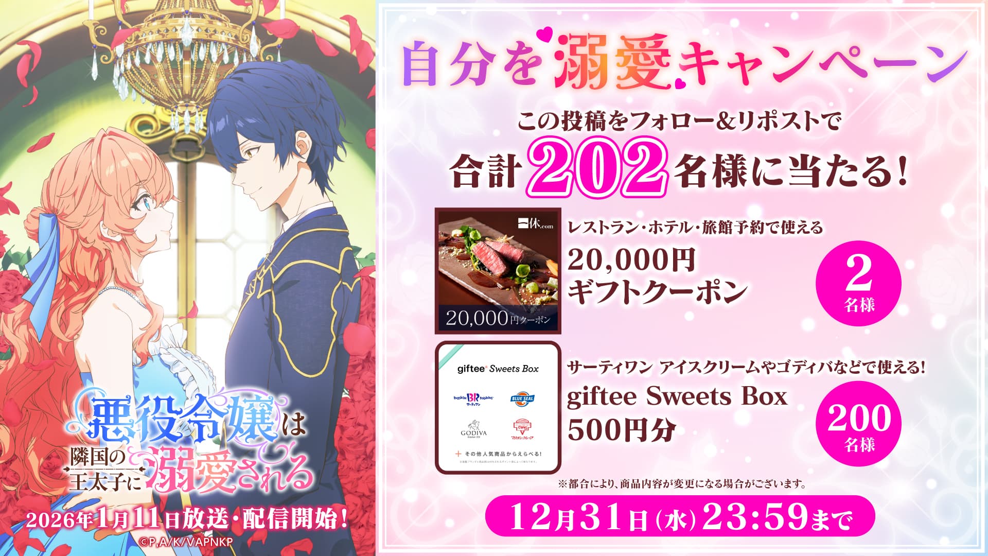 また、合計200名に豪華景品が当たる「自分を溺愛キャンペーン」も開催されます。レストラン・ホテル予約クーポンやスイーツギフトなど、作品の世界観を体験できるようなプレゼントが用意されており、ぜひ公式Xをチェックして参加してみてください。