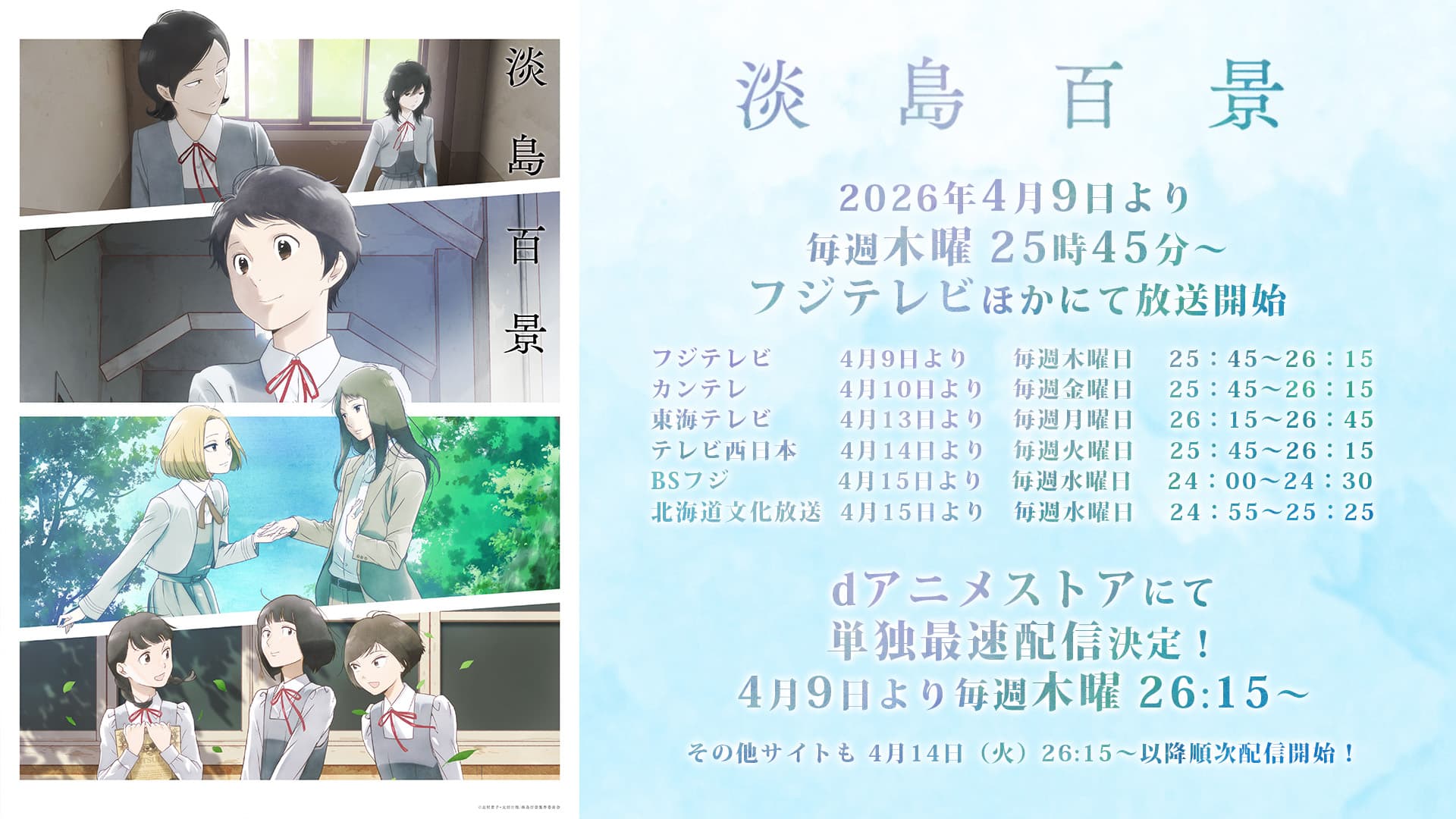 志村貴子先生の繊細な筆致で描かれ、多くの読者を魅了してきた『淡島百景』が、満を持してTVアニメ化されます!文化庁メディア芸術祭優秀賞を受賞したこの名作は、歌劇学校を舞台にした少女たちの青春グラフィティ。その待望のアニメ版が、いよいよ2026年4月9日(木)からフジテレビをはじめとする各局で放送スタート、さらにdアニメストアでは単独最速配信が決定しました!夢と希望、そして葛藤が織りなす少女たちの物語が、アニメーションとしてどのように表現されるのか、期待が高まりますね。