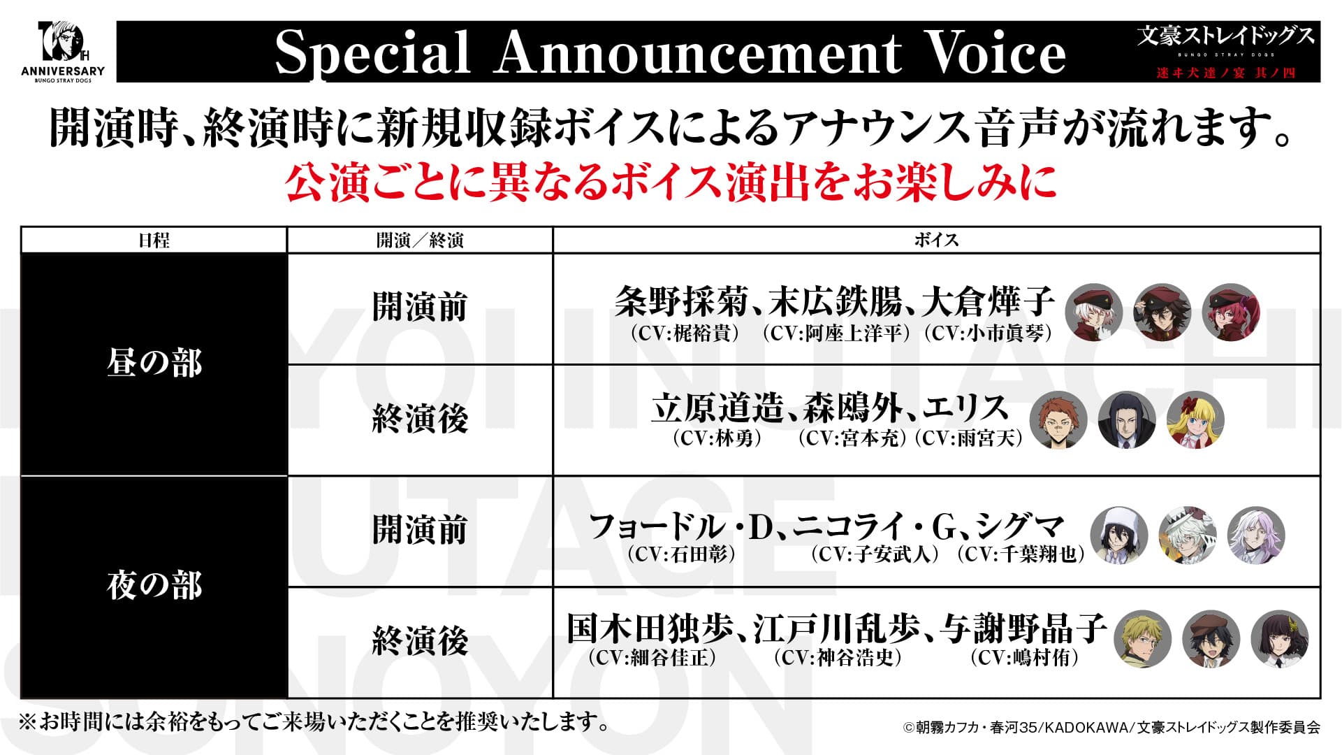 チケットはすでに最速先行の受付が開始されているものもありますので、ぜひこの機会を逃さず、記念すべき十周年のお祝いに駆けつけてくださいね!会場で皆さんと一緒に、『文豪ストレイドッグス』の新たな歴史を刻めることを楽しみにしています!