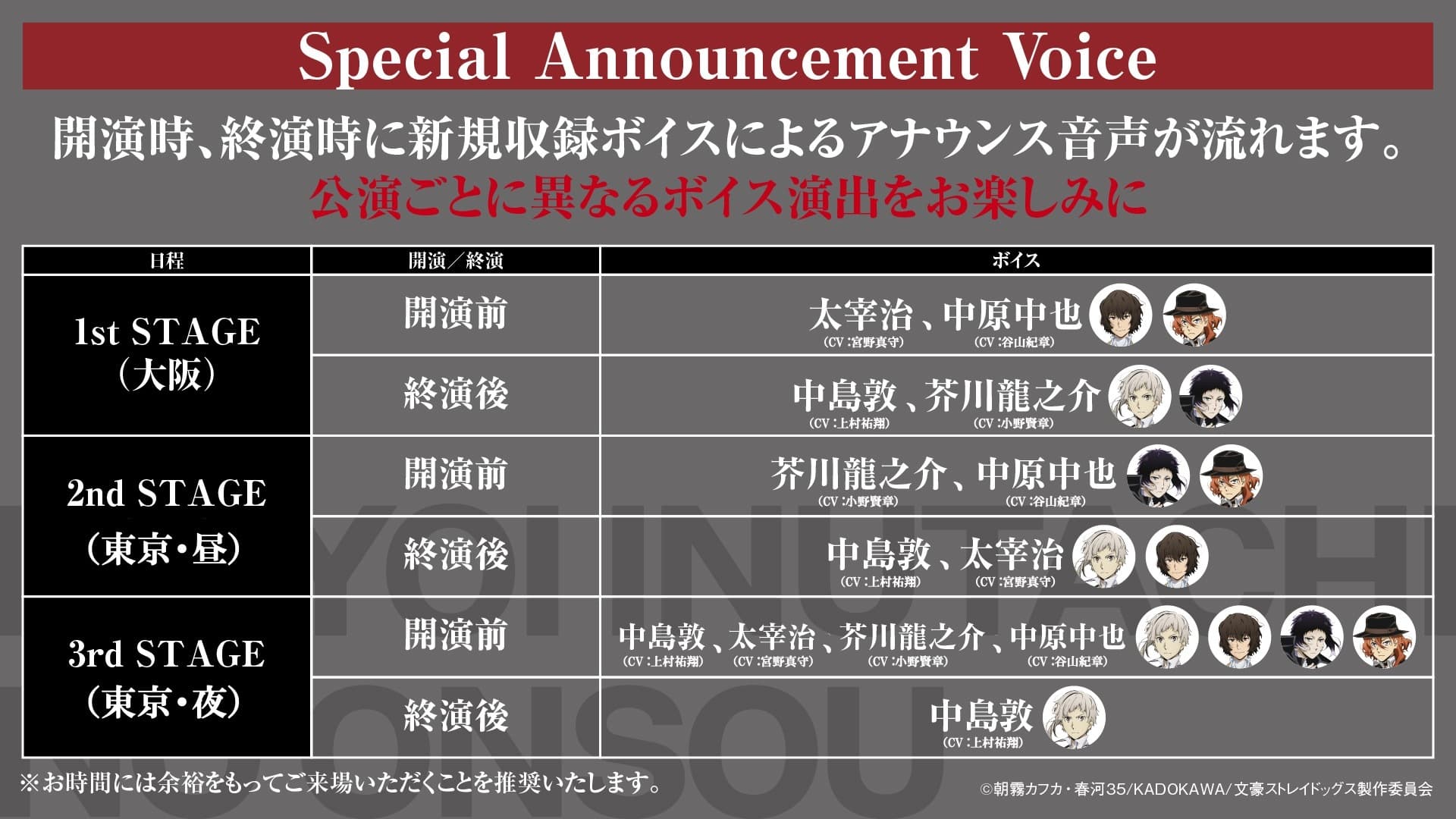 「迷ヰ犬達ノ音奏」でも、開演時と終演時に新規収録ボイスによるSpecial Announcement Voiceが流れます。各公演で異なるボイス演出が楽しめるので、どのキャラクターが登場するのか、ぜひ会場で確かめてみてくださいね!