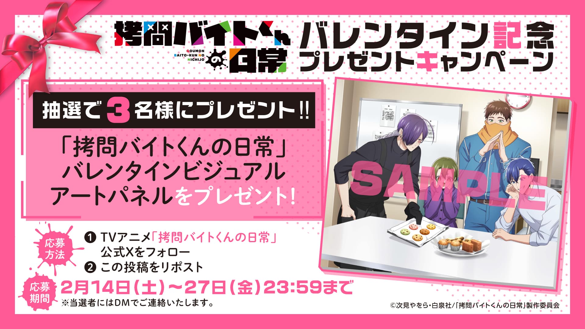 TVアニメ「拷問バイトくんの日常」が贈るバレンタイン企画は、ファンにとって嬉しいサプライズ満載でしたね!新しいビジュアルや、原作者書き下ろし&豪華声優陣によるシチュエーションPVは、作品への愛が感じられる素敵なプレゼントです。さらに、限定アートパネルが当たるXキャンペーンも実施中ですので、ぜひ参加して、この特別なバレンタインを一緒に盛り上げましょう!