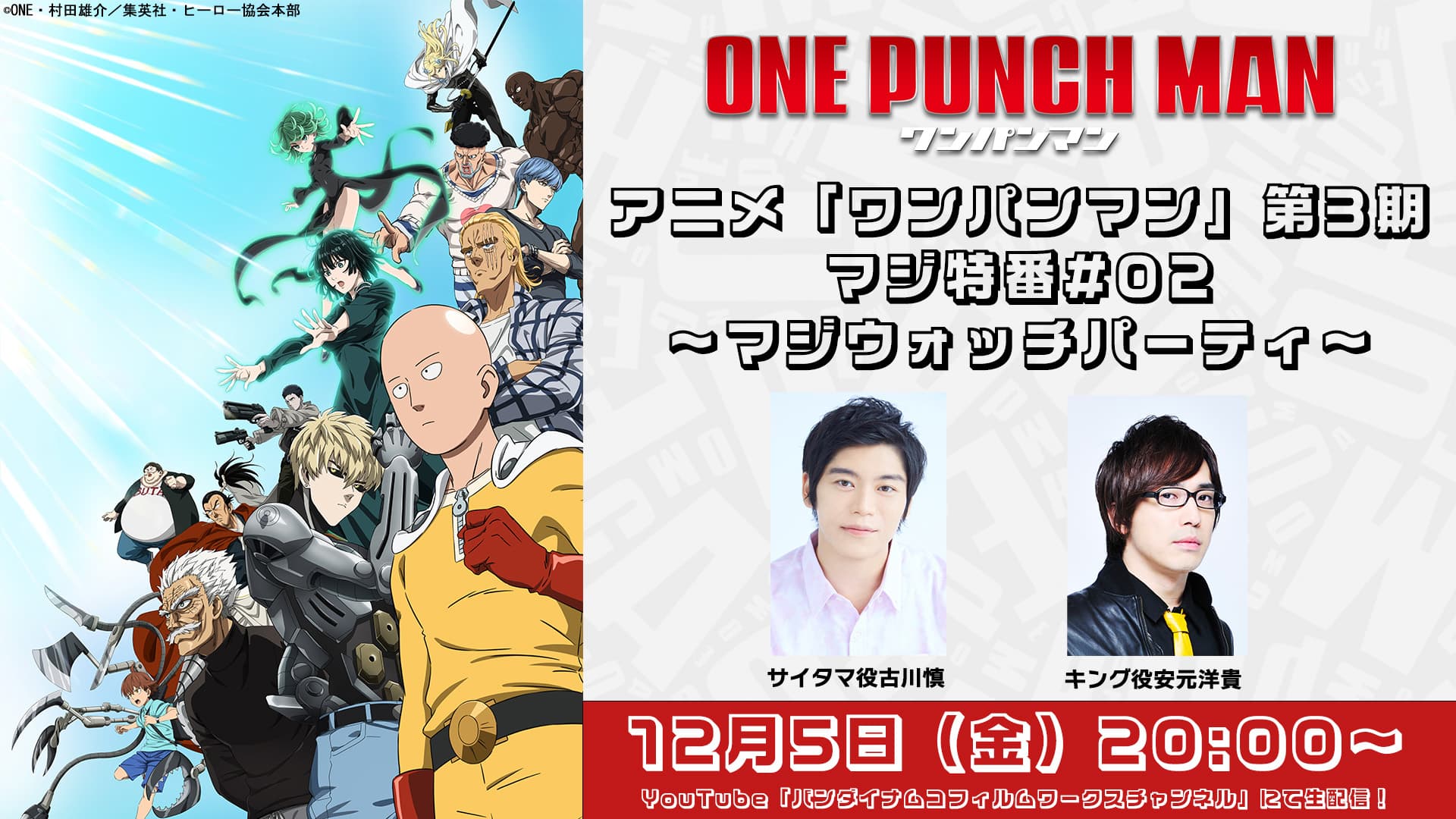 WEBコミック界のカリスマ・ONE先生とジャンプ最強遺伝子・村田雄介先生による超強力タッグで贈る大人気作品『ワンパンマン』。そのアニメ第3期をさらに盛り上げるスペシャルな企画が発表されました!サイタマ役の古川慎さんとキング役の安元洋貴さんが出演する特別番組「アニメ『ワンパンマン』第3期マジ特番#02~マジウォッチパーティ~」が、YouTubeにてプレミア公開されることが決定しました!