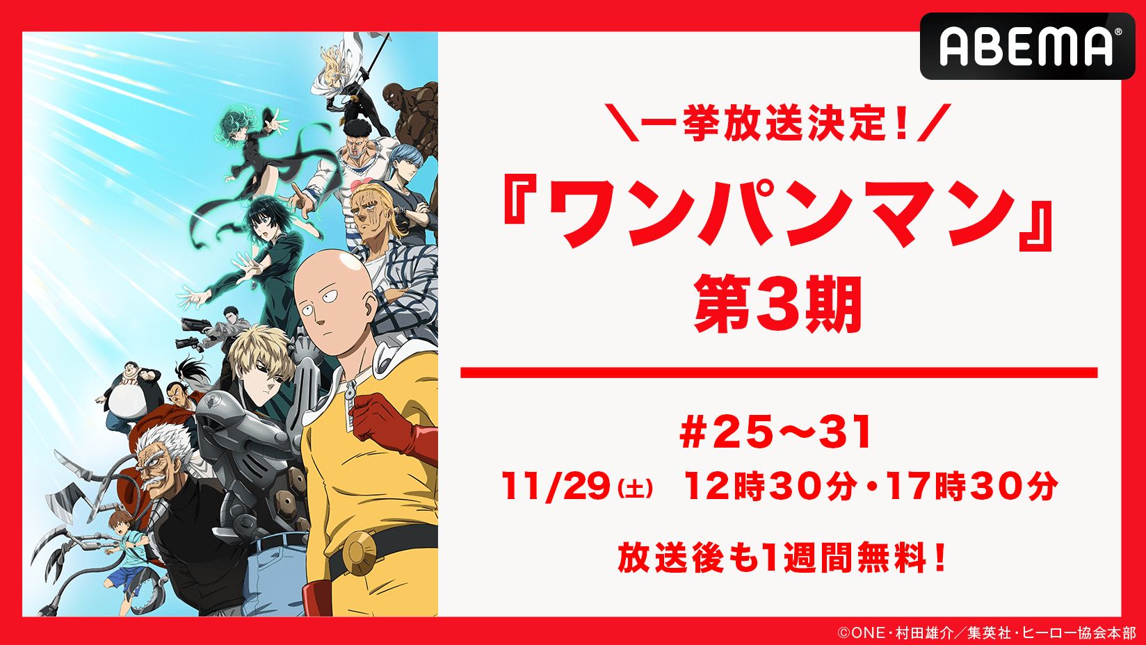 一挙放送は、11月29日(土)に2回に分けて実施されます。また、さらに嬉しいことに、「ABEMAビデオ」では第3期最新話までの無料視聴が可能となります!期間限定の無料配信なので、このチャンスを逃さずに、ぜひ『ワンパンマン』の世界を堪能してください。