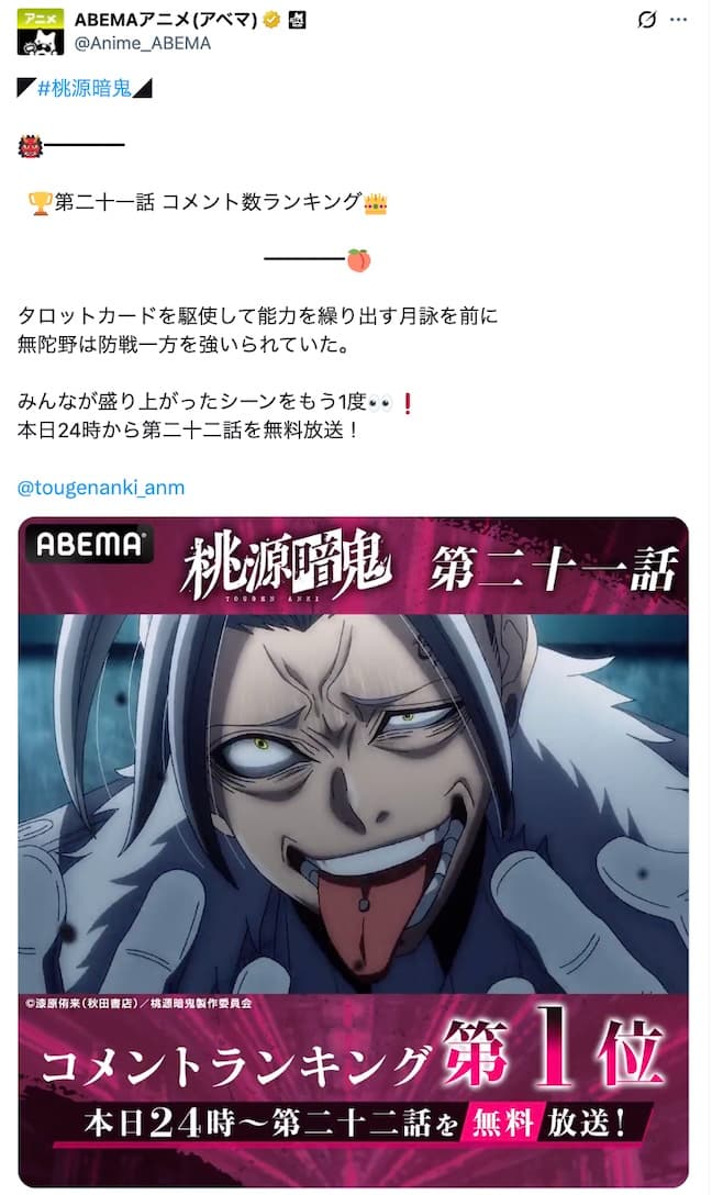 大人気漫画『桃源暗鬼』のTVアニメが「ABEMA」で国内最速配信中!この度、第二十一話「パーフェクト of運勢」放送時のコメント最多シーンTOP3が発表されました。鬼と桃太郎の血を引く者たちの壮絶な物語が、視聴者の心を掴み、SNSでも大きな話題を呼んでいます。