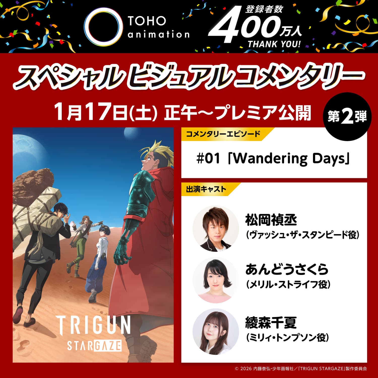 さらに嬉しいお知らせが届きました!TOHO animation YouTubeチャンネルの登録者数400万人突破を記念して行われているビジュアルコメンタリー企画の第2弾として、『TRIGUN STARGAZE』第1話「Wandering Days」の公開が決定しました!