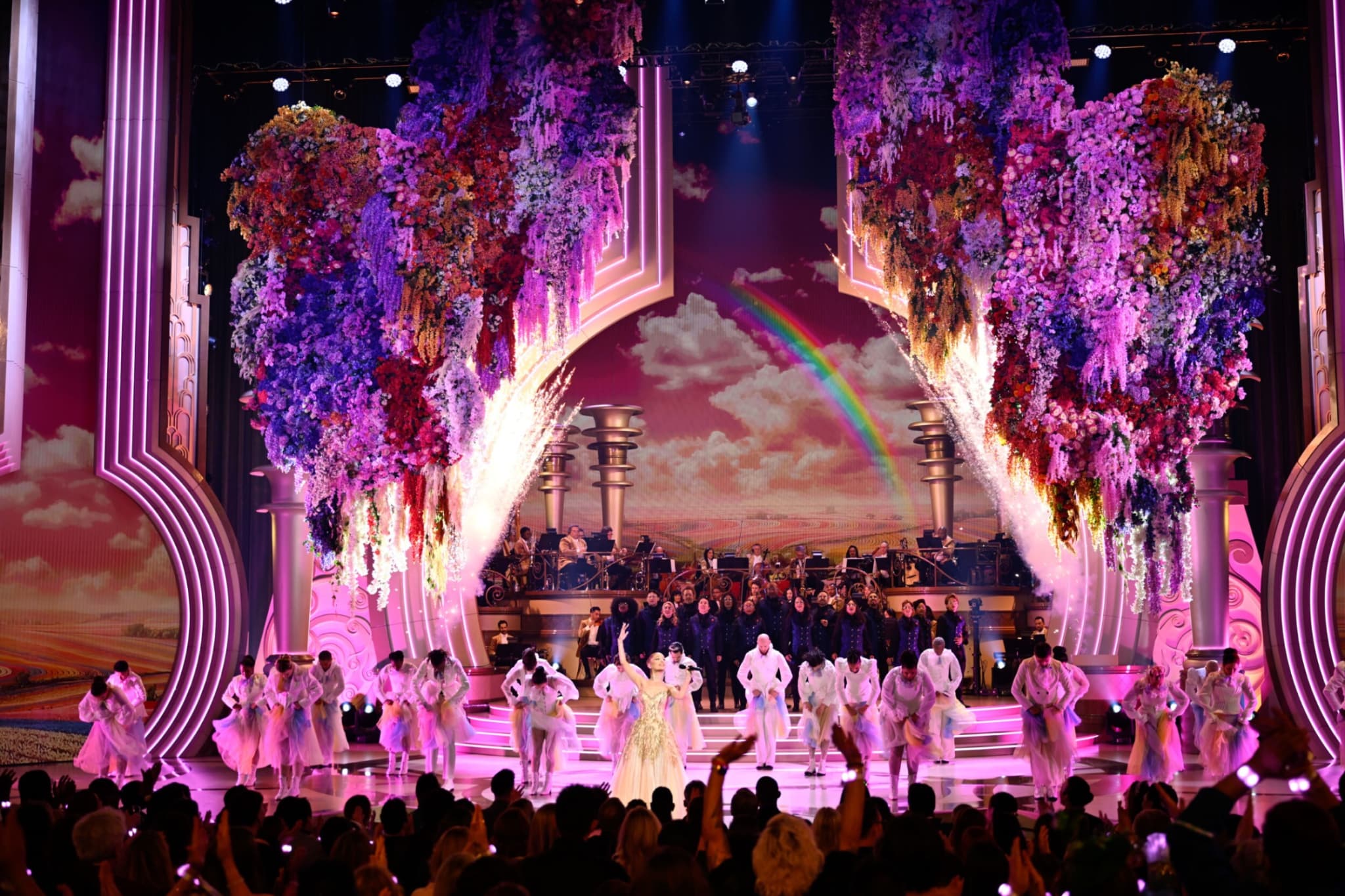 オーケストラの壮大な演奏と共に始まったオープニングナンバーで、会場のボルテージは一気に最高潮へと達しました。総立ちの拍手が贈られる中、マダム・モリブル役のミシェル・ヨーとオズの魔法使い役のジェフ・ゴールドブラムは、『ウィキッド ふたりの魔女』が全世界で受け入れられたことに感謝を述べ、今夜のイベントはファンの人たちのためのものだと強調しました。