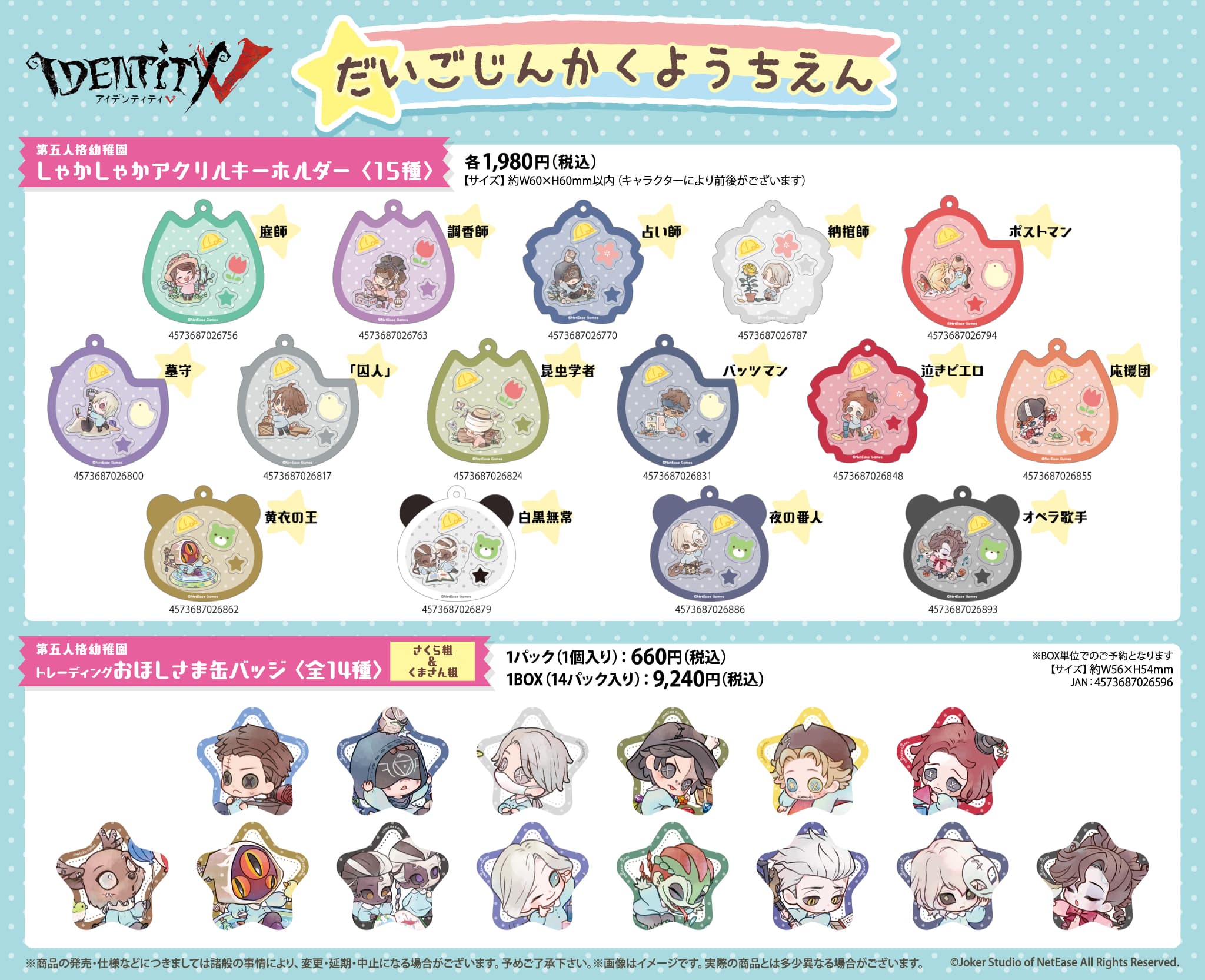 ちびキャラたちが幼稚園児になった、癒やし度満点の「第五人格幼稚園シリーズ」! おほしさま型のキュートな缶バッジは、思わず全種類集めたくなる可愛さです。さくら組とくま組、あなたはどちらの組がお好みですか?