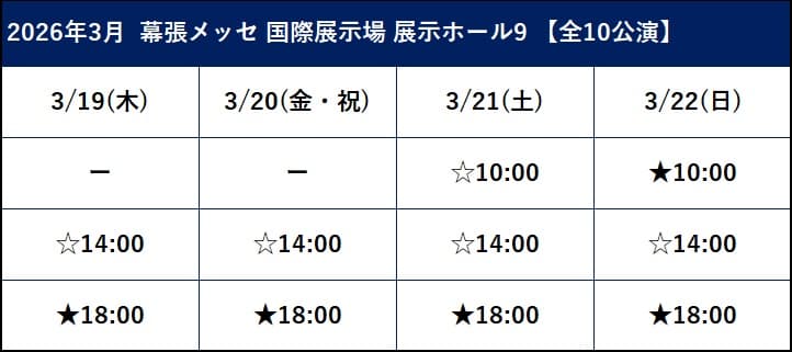 本公演は、2026年3月に幕張メッセで開催されます。週末を含む4日間の開催なので、ご自身の都合に合わせて参加しやすいですね。